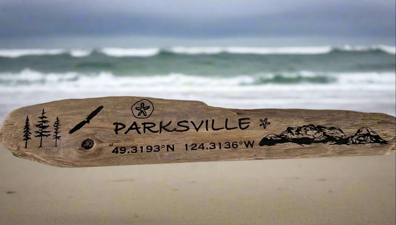 Drift Roots - Driftwood Sign - "Parksville" with coordinates, mountains & eagle