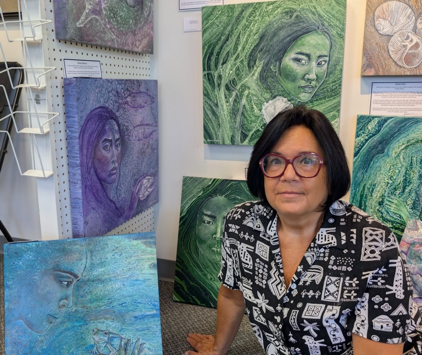 Her artwork is primarily self taught, portraying a blend of traditional stories using modern images and materials. Barbara’s unique craft skills are honed from many years of creating beaded, cloth and leather regalia for Native pow wows and ceremonies.Â