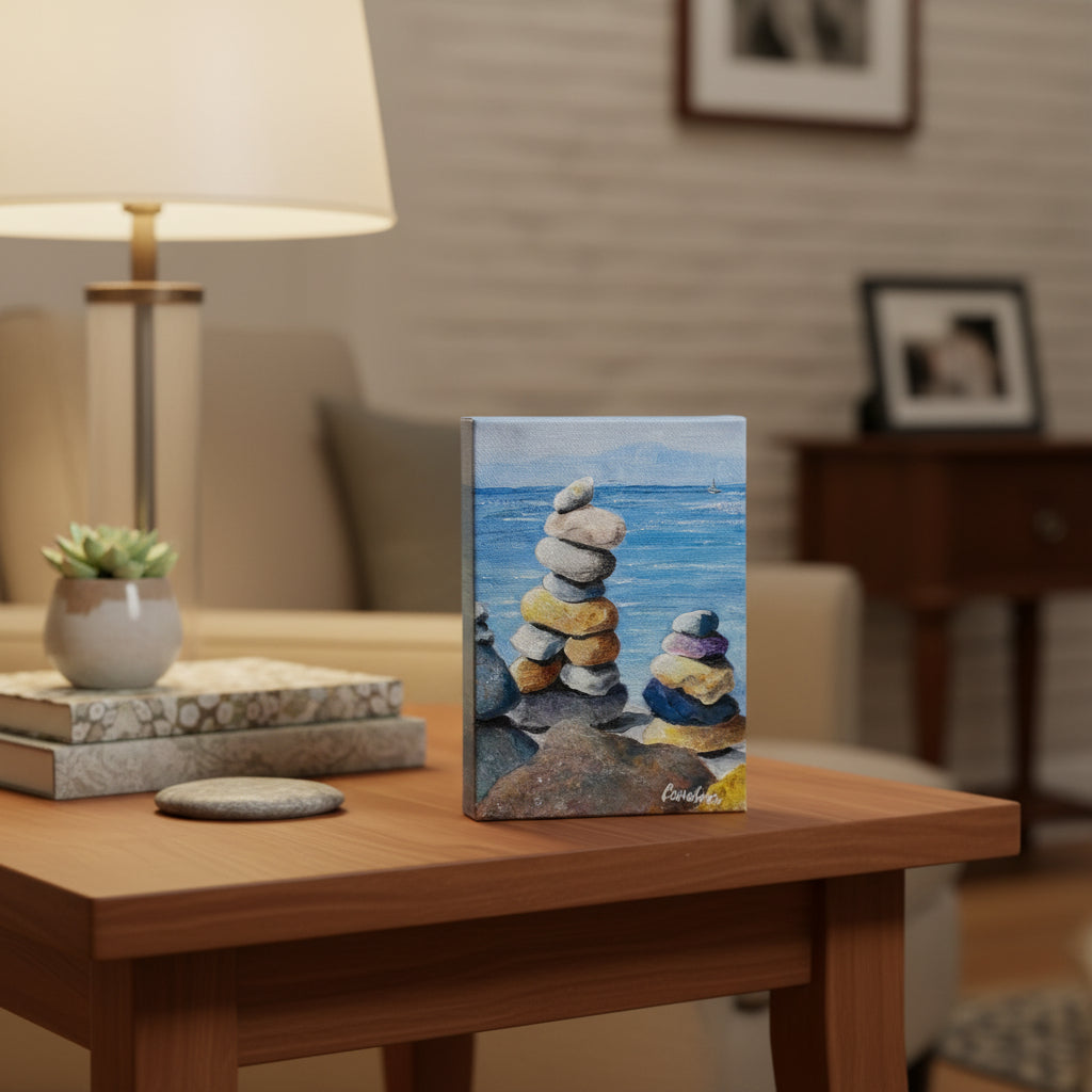 This little painting is not wired to hang but can easily stand on a table of bookcase.