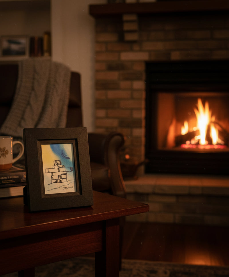 Dianne Mercredi - Pen & Watercolour - Inukshuk under Northern Lights, framed