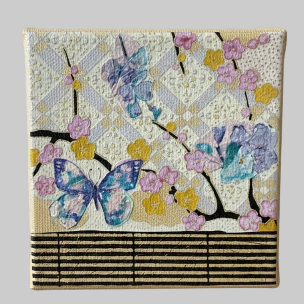 Llinda Greig - Painting - Bijou 6 - Butterfly & flowers, gold 4" x 4"